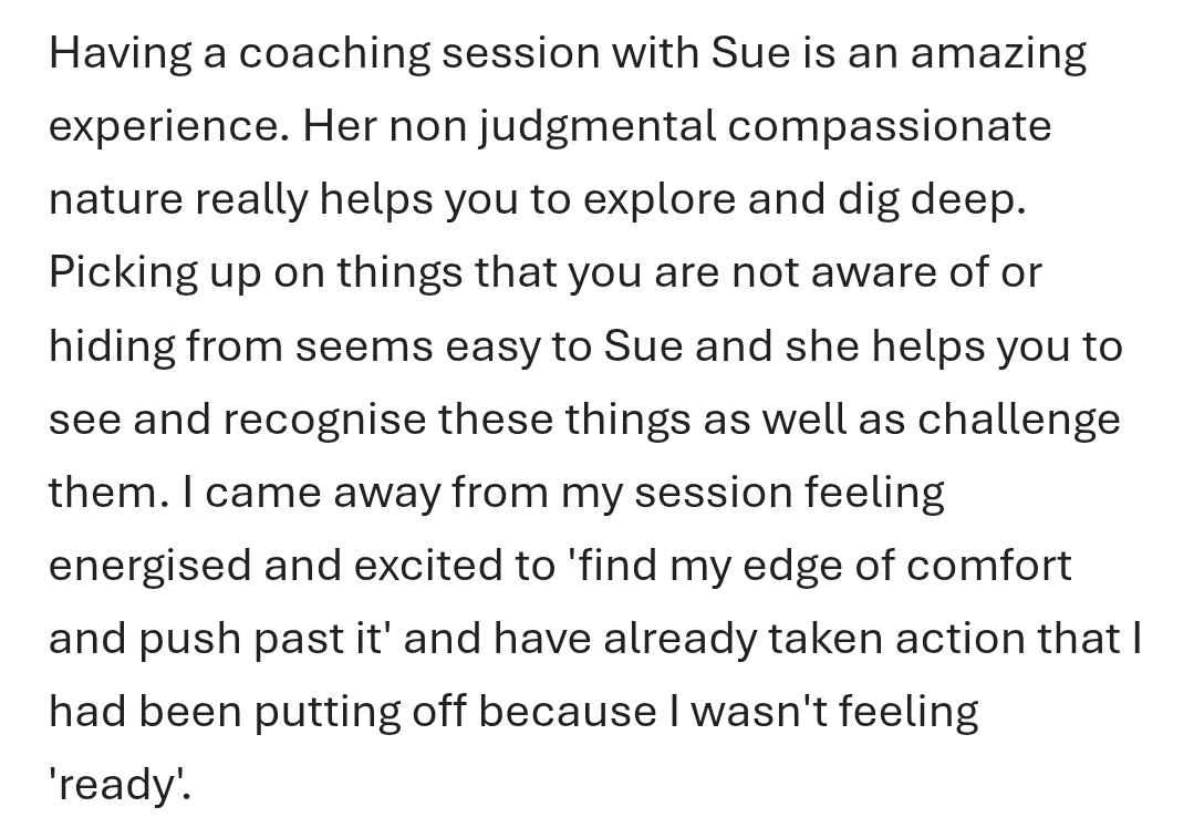 I’m Sue – a life and business coach who’s obsessed with helping ambitious women stop running on fumes. I blend my background in health & wellbeing with over 20 years of running my own business to help you build habits, energy and systems that actually work in real life.